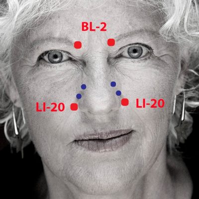 Tryk fast ned i punkt BL-2 på hver side af ansigtet med dine pegefingre og lav cirkulære bevægelser, hvor du masserer i punktet (ikke glider henover huden, da det vil slide på huden).